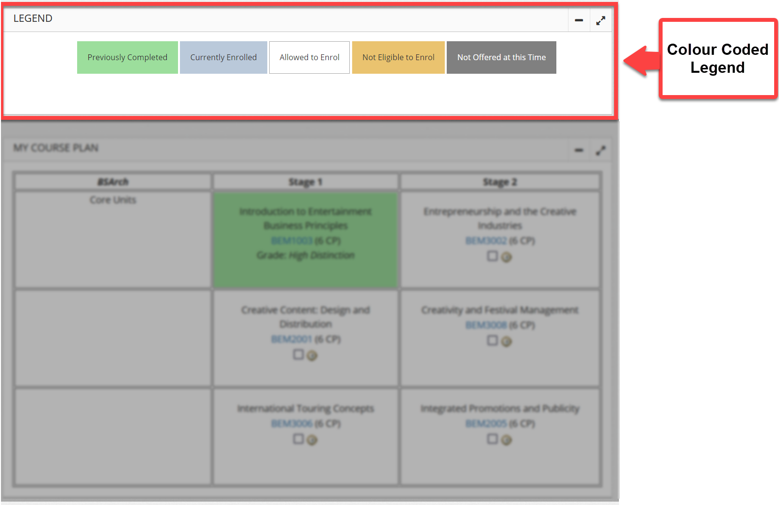 <table data-header-hidden><thead><tr><th width="150"></th><th></th></tr></thead><tbody><tr><td><strong>Colour</strong></td><td><strong>Meaning</strong></td></tr><tr><td><strong>Green</strong><img src="https://1246578764-files.gitbook.io/~/files/v0/b/gitbook-x-prod.appspot.com/o/spaces%2FC21t2SaV2eKaLxvtR27D%2Fuploads%2FgCppIarqnGrx5AAcrx9h%2Fimage.png?alt=media&#x26;token=02ae0433-feed-4028-b573-7798fd63e77b" alt="" data-size="line"></td><td>The student has previously completed this unit. Units with this colour would normally contain the Grade Outcome the student was awarded for the completed unit.</td></tr><tr><td><strong>Blue</strong><img src="https://1246578764-files.gitbook.io/~/files/v0/b/gitbook-x-prod.appspot.com/o/spaces%2FC21t2SaV2eKaLxvtR27D%2Fuploads%2Fr0tGmlMfoXA4XQjKiphV%2Fimage.png?alt=media&#x26;token=10796b8a-3e39-4514-bd4b-ad16e2c00693" alt="" data-size="line"></td><td>The student is currently enrolled in this unit. Units with this colour will also contain the equivalent Credit Points.</td></tr><tr><td><strong>Orange</strong><img src="https://1246578764-files.gitbook.io/~/files/v0/b/gitbook-x-prod.appspot.com/o/spaces%2FC21t2SaV2eKaLxvtR27D%2Fuploads%2FFQtOWHQiput8bvDBGT0z%2Fimage.png?alt=media&#x26;token=491993b5-4a24-4539-95f1-a6ea620b5699" alt="" data-size="line"></td><td>Unit is not available because prerequisites have not been met. Prerequisite units should be completed before these units become available for enrolment. This also includes that the Unit may have been set by other constraints that make the unit not eligible for the Student to enrol.</td></tr><tr><td><p><strong>White</strong></p><p><strong>(with</strong> 🔲 <strong>)</strong><img src="https://1246578764-files.gitbook.io/~/files/v0/b/gitbook-x-prod.appspot.com/o/spaces%2FC21t2SaV2eKaLxvtR27D%2Fuploads%2FsH1C2LuihAJ9hnY3Wtlv%2Fimage.png?alt=media&#x26;token=a92a4cbd-7573-4b64-b0ce-afac97f685c9" alt="" data-size="line"></p></td><td>Unit can be selected for enrolment. Units with this colour will also contain the Session Times that are available for the student to choose from (if there are other available session times offered).</td></tr><tr><td><p><strong>White</strong></p><p><strong>(without</strong> 🔲<strong>)</strong><img src="https://1246578764-files.gitbook.io/~/files/v0/b/gitbook-x-prod.appspot.com/o/spaces%2FC21t2SaV2eKaLxvtR27D%2Fuploads%2FEtAmqPR02LA4RW2sqc0A%2Fimage.png?alt=media&#x26;token=c16f5188-d5cc-411b-aa18-30460b74166e" alt="" data-size="line"></p></td><td>Unit has been scheduled, student meets prerequisites, but the enrolment period has not yet opened, and students are prevented from enrolling in the unit. Note: Staff member needs to double check the <a href="../../../../../system-configuration/workflows/time-periods#d-edit-configuration-periods">configuration time period</a> called “<strong>UNIT_ENROLMENT</strong>”.</td></tr><tr><td><strong>Grey</strong><img src="https://1246578764-files.gitbook.io/~/files/v0/b/gitbook-x-prod.appspot.com/o/spaces%2FC21t2SaV2eKaLxvtR27D%2Fuploads%2FGcV87gnEnxU0cE31YEeK%2Fimage.png?alt=media&#x26;token=80c89aa4-e187-4c2a-ae25-1c11230f131d" alt="" data-size="line"></td><td>Unit is not scheduled for the next enrolment period. This rule overrides the Orange rule where a prerequisite has not been met, i.e. when a prerequisite has not been met and the unit has not yet been scheduled, the unit will be shown in a grey cell.</td></tr></tbody></table>