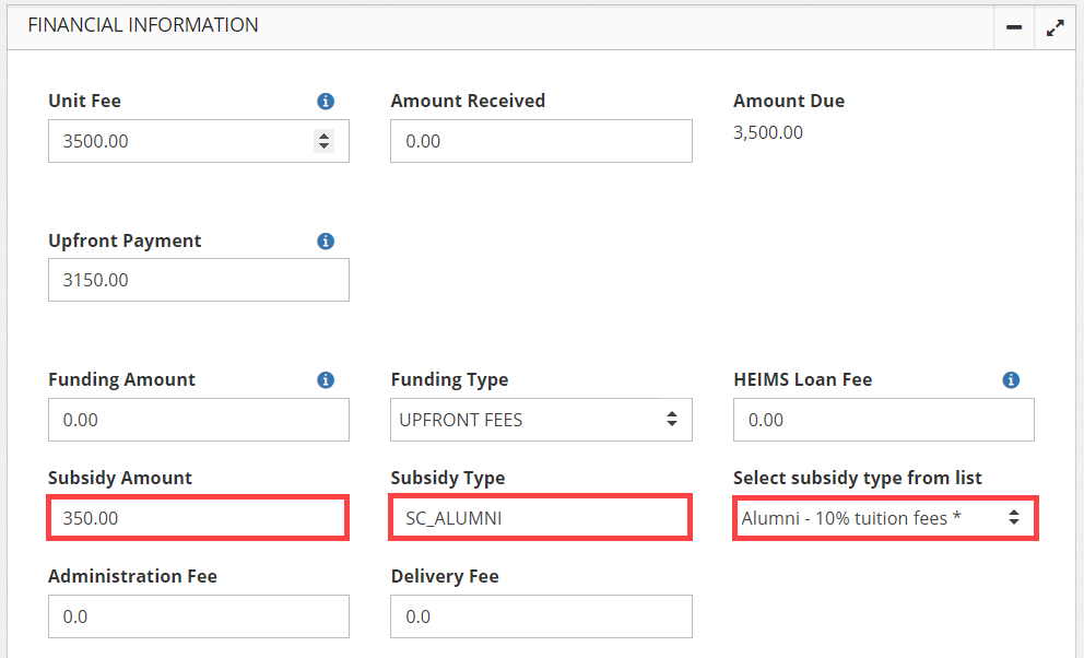 <figure><img src="https://1246578764-files.gitbook.io/~/files/v0/b/gitbook-x-prod.appspot.com/o/spaces%2FC21t2SaV2eKaLxvtR27D%2Fuploads%2FCWqzCNgnQvByk9ieqE5k%2Fimage.png?alt=media&#x26;token=34a0072c-92d4-4c64-be73-3cf46041fc9f" alt=""><figcaption><p>Unit Enrolment Financial section: Subsidy or Scholarship fields</p></figcaption></figure>
