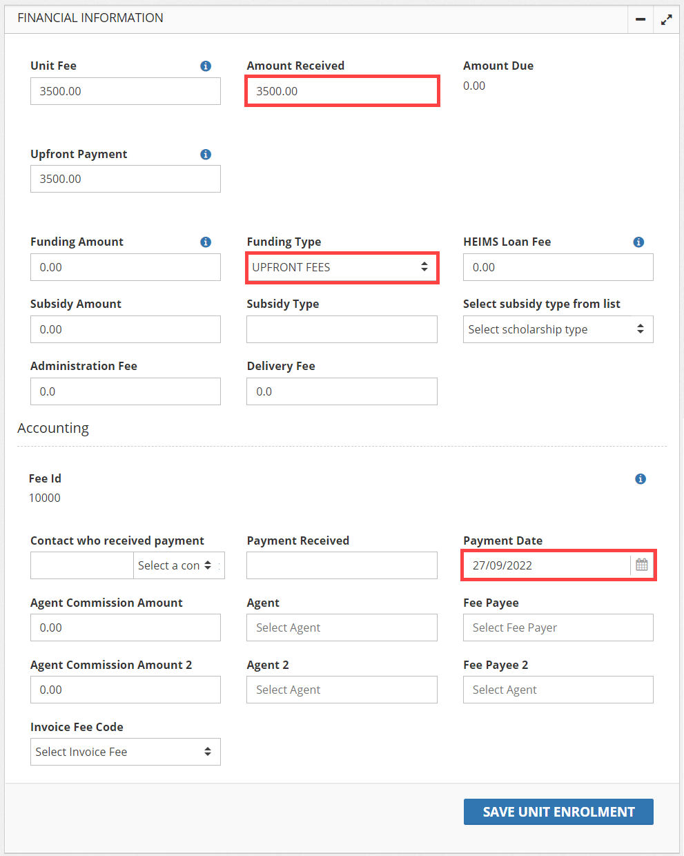 This page will provide you with instructions on how to record a full payment upfront to a Unit Enrolment