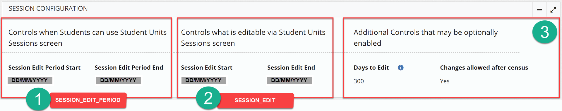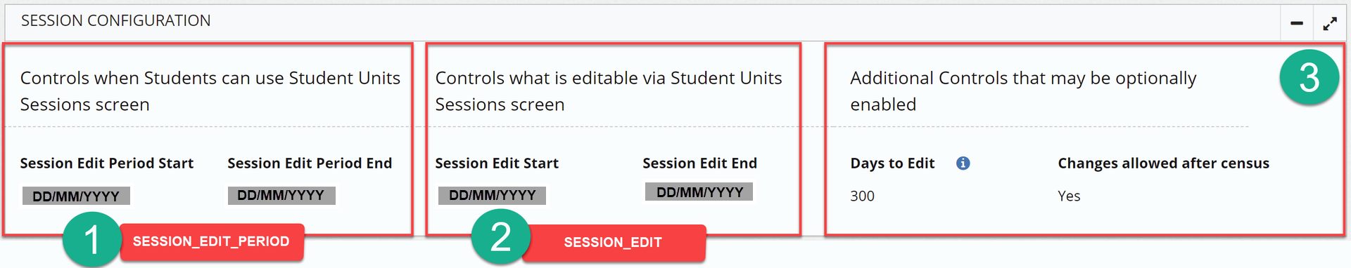 The two configuration periods help you to restrict when students are able to amend their session enrolments, as well as allow you to control the data that is editable on the screen.