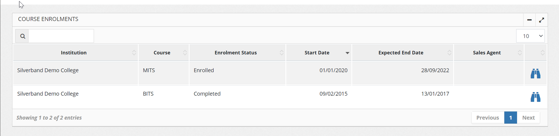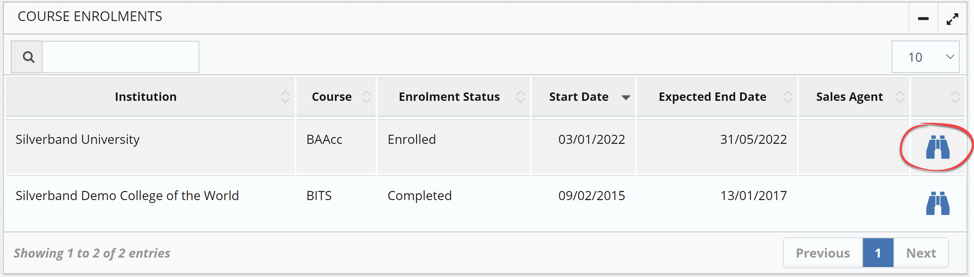 This section displays a list of past and current course enrolments for the student. To ensure the correct course enrolment is loaded, you can click on the binoculars icon to switch between the currently loaded course enrolment record.