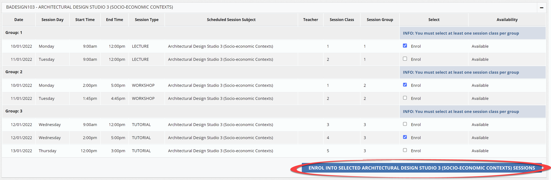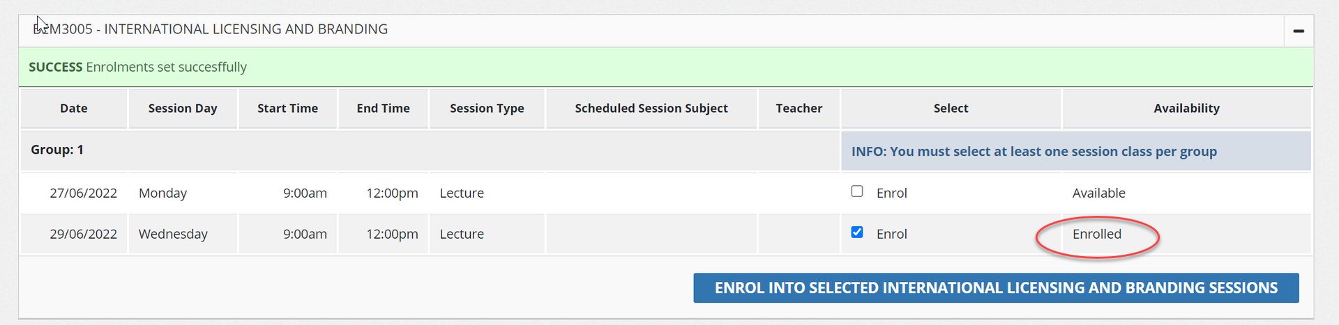When the student successfully enrols at the session time they chose, the Availability status changes from โAvailableโ to โEnrolled' and the success message is shown at the top of the screen.