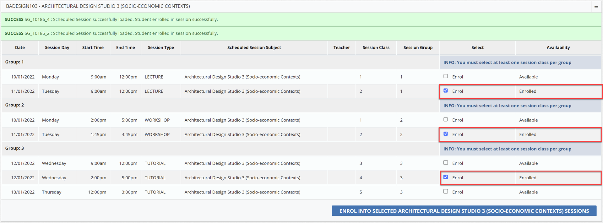 After selecting the preferred session, click the ENROL INTO SELECTED SESSIONS button. A success message will appear and the student is now enrolled on those selected sessions. Note the status will now be set as Enrolled on those sessions that you just enrolled into.