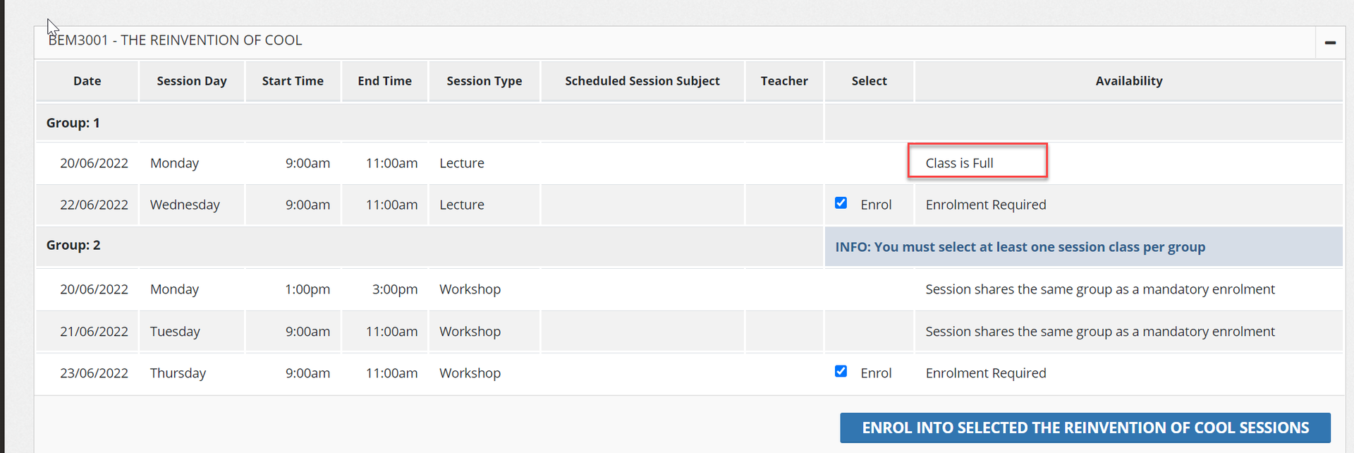 When a class reaches its capacity, students will see the Availability message โClass is Full' and the session will no longer be selectable as shown in the screenshot: