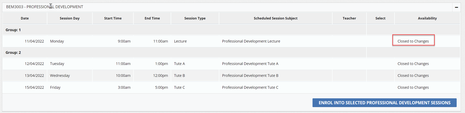 When todayโs date is outside of the time period id 'SESSION_EDIT', students will see the availability column showing the status โClosed to Changesโ.