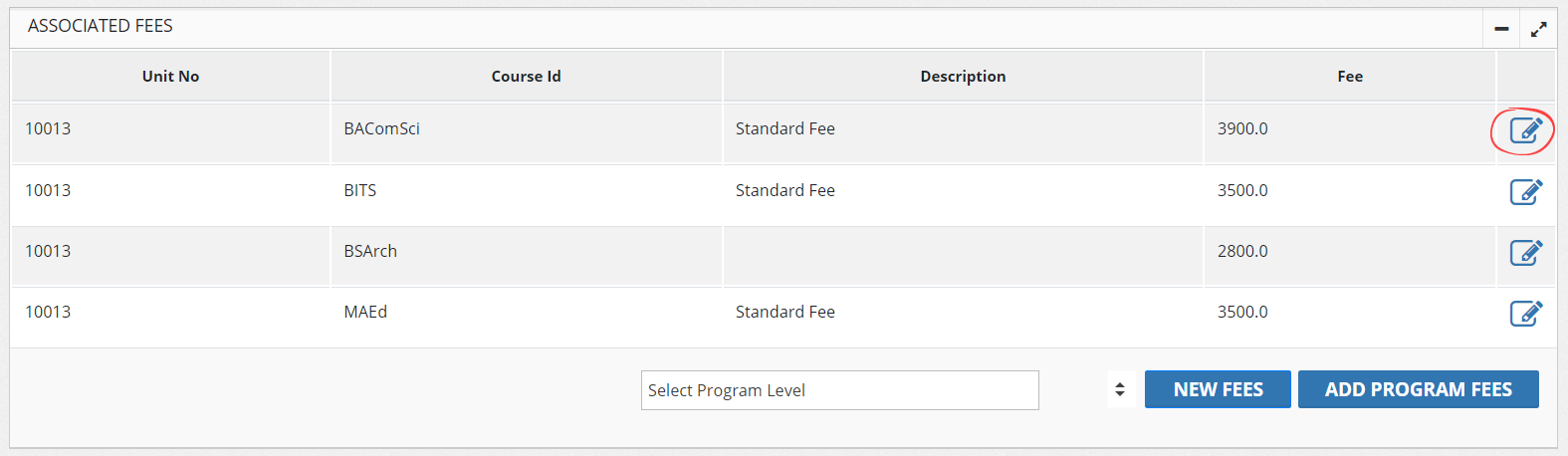 To edit all/selected Fee Items to the same amount, click the **EDIT** button on any of the Fee Items.