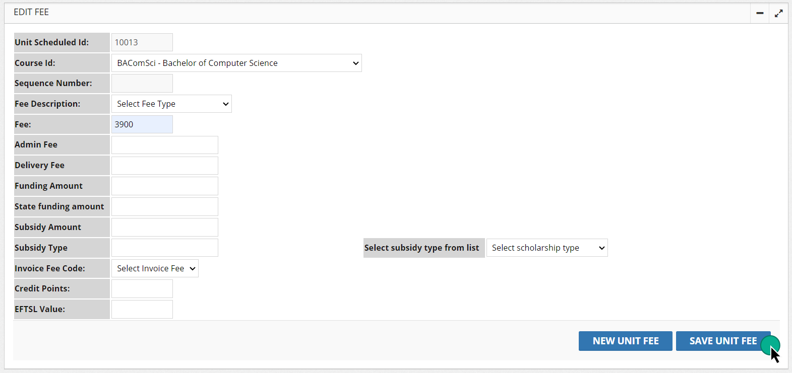 The Unit Fees associated with a Scheduled Unit can be edited manually per each Scheduled Unit record. Note when you edit the Unit Fee Amount for the Scheduled Unit with existing Unit Enrolments, the new Unit Fee set or any changes you've made will not reflect in the related Unit Enrolments. The changes will only take effect on new Unit Enrolments created after making the changes.