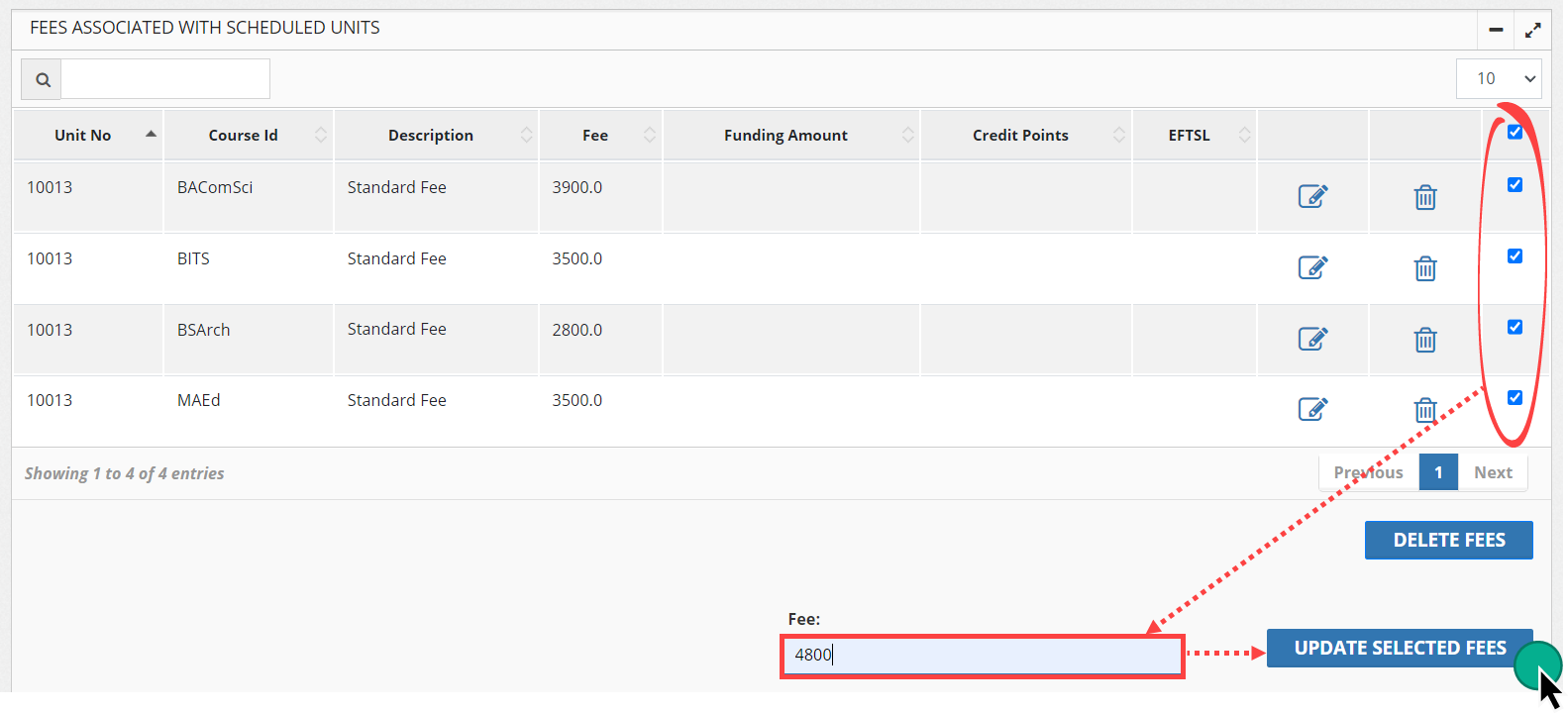 3. Click the select heading to select all the items on the list or select the fee items that are required, enter the amount that applies for all/selected items, and click the **UPDATE SELECTED FEES** button.