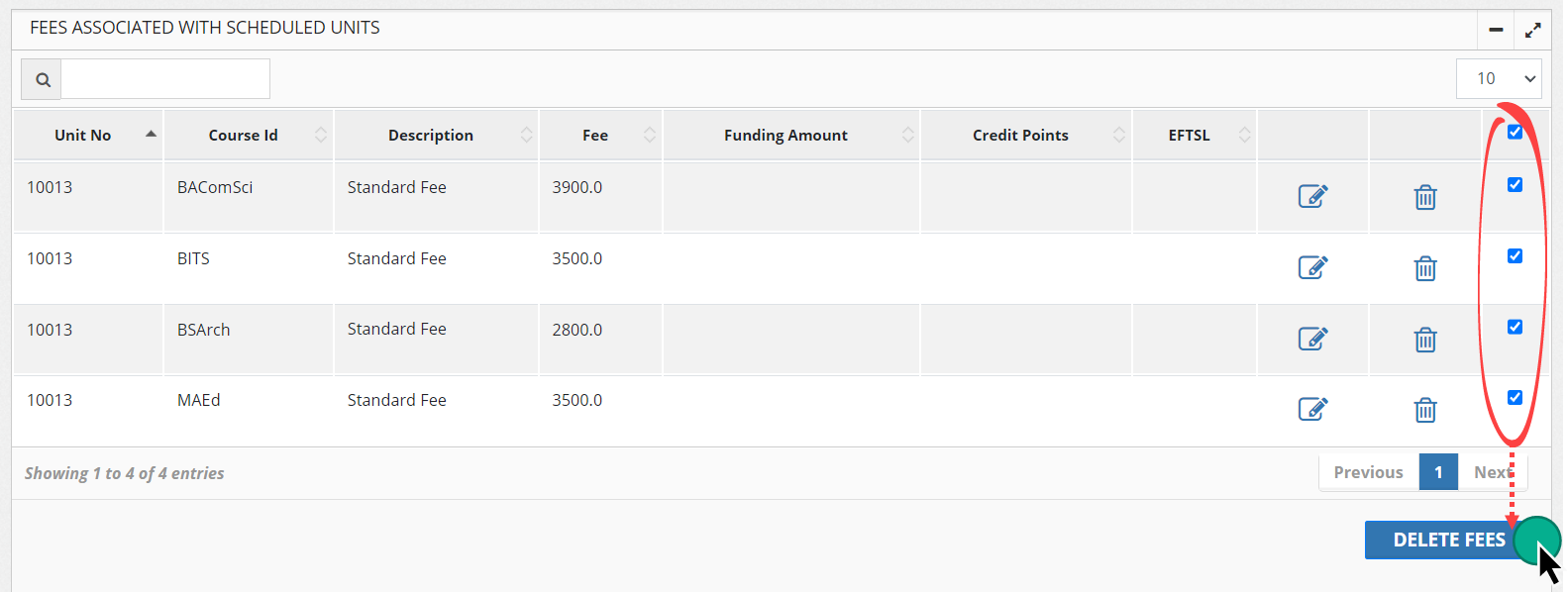 To Delete a Unit Fee item, click the **DELETE** button against the Unit Fee item that you want to delete or select the checkboxes on the right against the Unit Fee items that you want to be deleted and then select the **DELETE FEES** button.